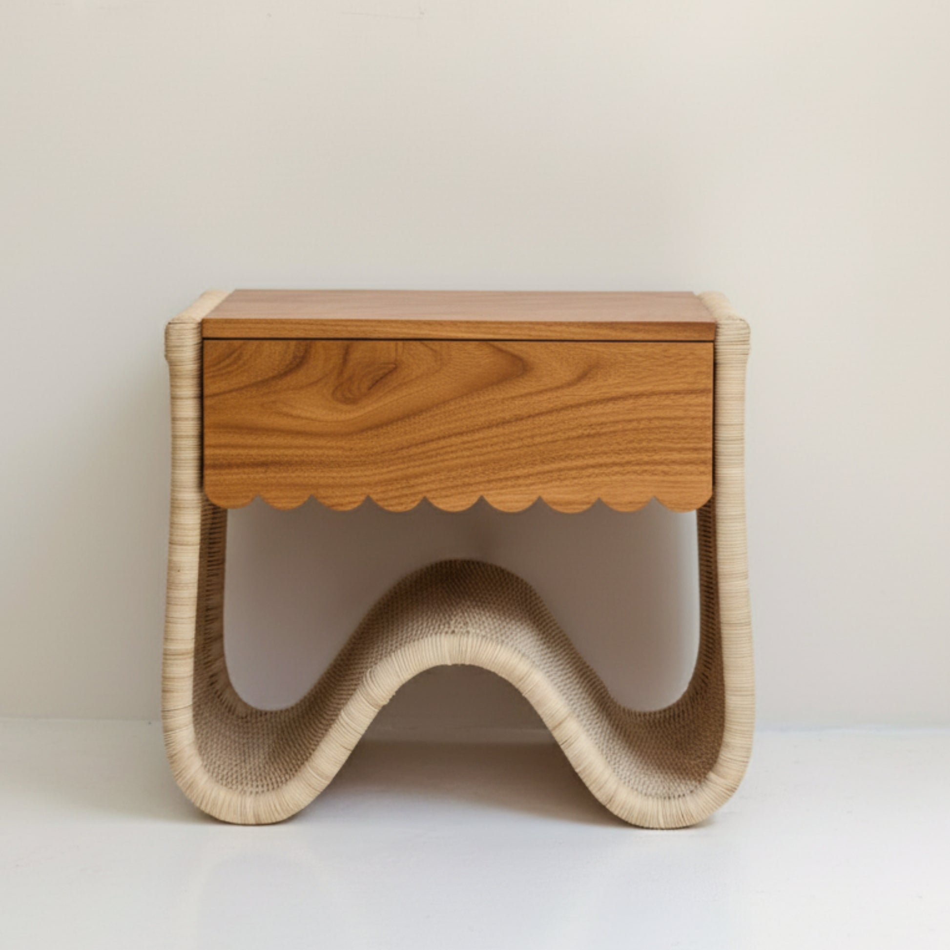 Crafted with a natural wood top and handwoven rattan frame, the Ripple Nightstand brings warmth, texture, and sculptural flow to your space.